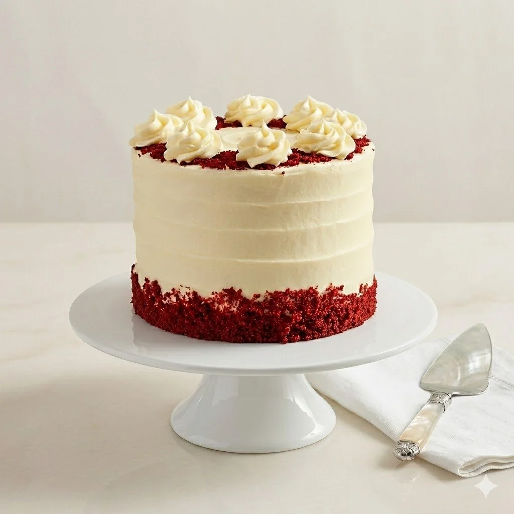 Rich Red Velvet cake filled and iced with Cream Cheese, decorated with Vanilla Buttercream and Red Velvet Crumbles