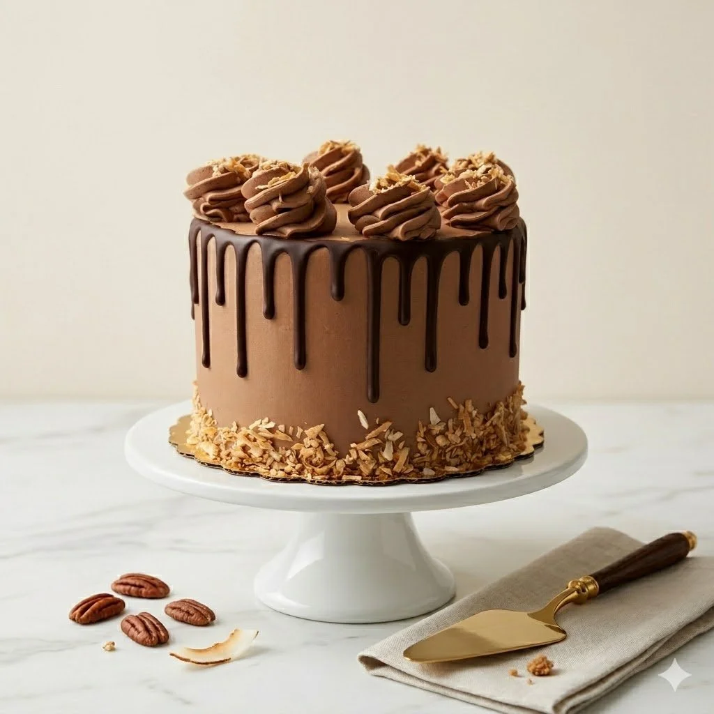 This classic cake is made with three layers of Chocolate Sponge Cake and filled with Sweet Coconut-Pecan. filling. It is iced with Dark Chocolate Buttercream and decorated with a Dark Chocolate Glaze and Toasted Coconut