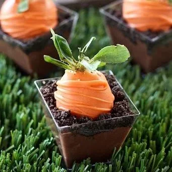 Chocolate-covered Strawberry decorated like a Carrot in Chocolate Mousse “Dirt”